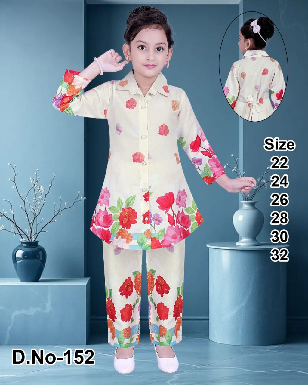 This lovely girls’ multicolor floral tunic and pant set is a fantastic choice for any young girl looking for a bright and comfortable outfit. The two-piece ensemble includes a flared tunic with a collared neckline and full button-down front, paired with comfortable, straight-leg pants. Both pieces are a light cream color and are decorated with a vibrant, all-over floral pattern in a lively mix of red, pink, orange, and green. The tunic also features a tie-waist detail in the back for a perfect fit. This cheerful set is a stylish and playful addition to any wardrobe, available in sizes from 22 to 32.