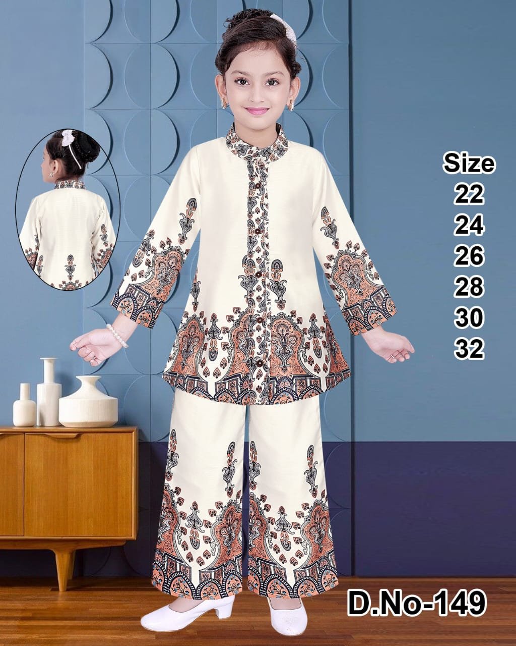 This elegant girls’ printed tunic and palazzo set is a stunning choice for any special occasion. The ensemble includes a stylish tunic with a high, Mandarin-style collar and a delicate ruffled hem, paired with comfortable, wide-leg palazzo pants. Both pieces are a beautiful off-white color and are decorated with an intricate paisley and floral pattern in shades of brown, black, and peach. This matching set offers a sophisticated and traditional yet modern look, perfect for festive events or family functions. It’s available in sizes from 22 to 32 to ensure a great fit.