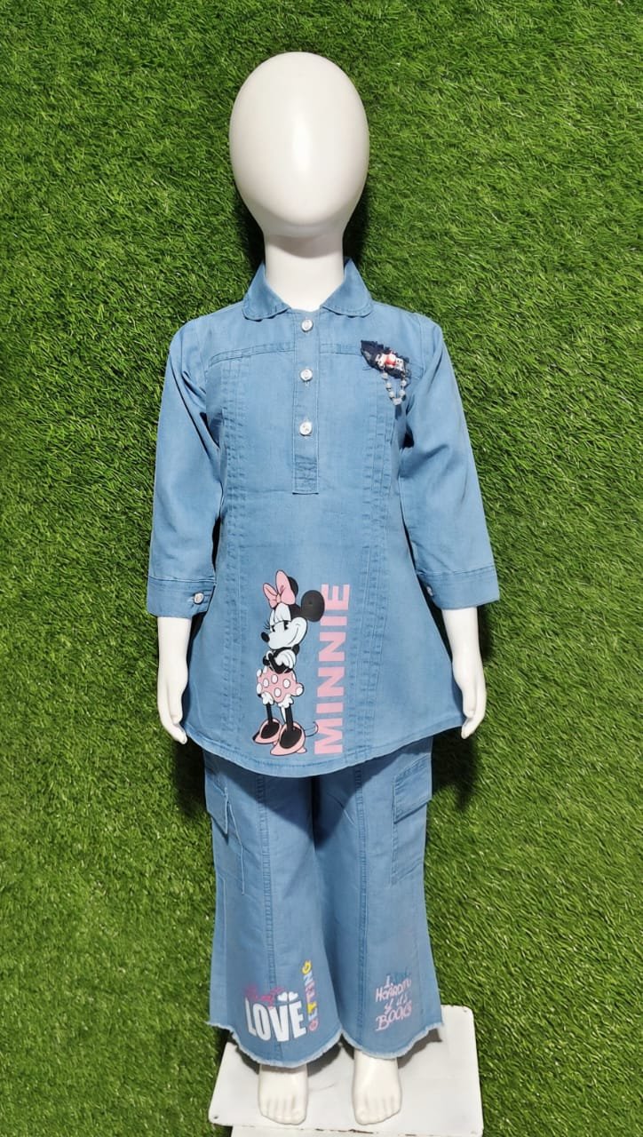 The image showcases a stylish denim outfit for kids, featuring a jacket and matching pants with fun graphics like “Sweet LOVE”, “FUNDAY”, and ice cream cones. The outfit appears to be designed for a child, given the mannequin’s size and the playful designs. Would you like to know more about the outfit’s fabric, size range, or where it’s available?