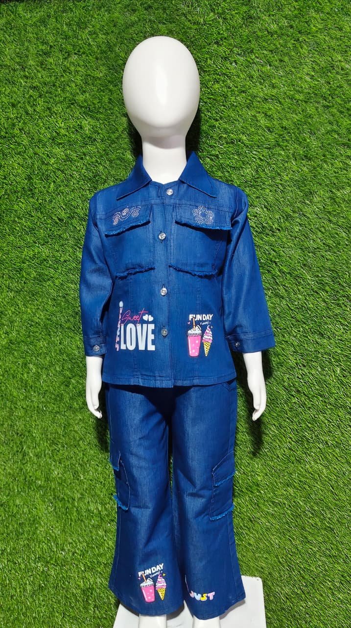 The image showcases a stylish denim outfit for kids, featuring a jacket and matching pants with fun graphics like “Sweet LOVE”, “FUNDAY”, and ice cream cones. The outfit appears to be designed for a child, given the mannequin’s size and the playful designs. Would you like to know more about the outfit’s fabric, size range, or where it’s available?